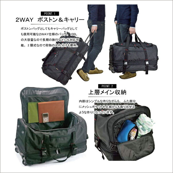 軽くて丈夫な100リットル、大容量のボストンキャリーバッグです。