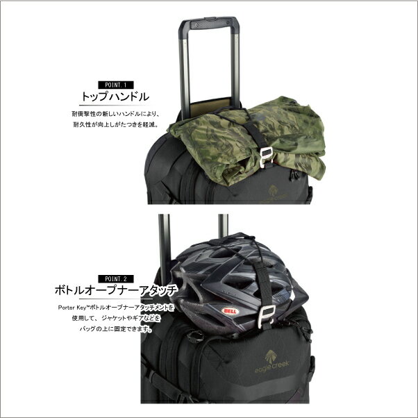 ギアウォーリアー4ウィール C.O GEAR WARRIOR 4-Wheel CARRY-ON 商品詳細 容量:38L(拡張時:41L) 重量:3.08kg 素材:100% Recycled Poly Neo Diamond,210D Exo Skeleton,600D Recyled Poly,Polycarbonate 寸法:35.5×56×23cm(拡張時:35.5×55×26cm) ・拡張可能なメインコンパートメント ・パッド入りタブレットスリーブ ・ボトルオープナーアタッチメント ・耐久性のあるスピナーホイール ・ポリカーボネート使用の本体ボトム ・コンプレッションストラップ ・耐衝撃ハンドル ・100%リサイクルPETリップストップ素材 ・耐水性 ・盗難防止の為のセントラルロックポイント ・グローブを着用した状態でも容易に操作できるジッパープル ・複数のグラブハンドル EagleCreek イーグルクリーク ギアウォーリアー 4ウィールキャリーオンは4ウィールタイプのキャリーバッグです。