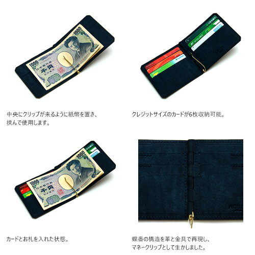 Detail 商品説明 ■素材:牛革 ■サイズ:W10.7× H9× D1(cm) ■重量:約50g 通常のマネークリップは、基本閉じた状態で収まるように端がステッチで押さえてありますが開きづらいのが弱点でした。