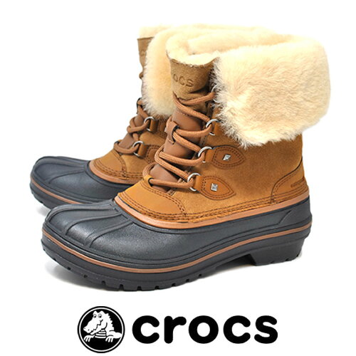 CROCS クロックスのレディース スノーブーツです! 履き口に羊毛を使用した高級感のあるウィンターブーツは本革スエードのシャフトにフェイクヌバックのトリム、ブーツ内は柔らかいフェイクシアリングを使用しています。