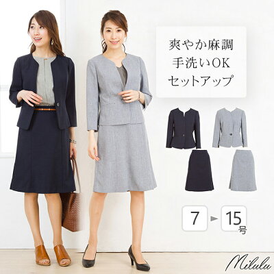 スーツ レディース ジャケット スカート 膝丈 スーツ ビジネス セレモニー フォーマル 春 夏 用 春夏 サマー 涼しい 洗える ウオッシャブル ショート丈 七分袖 リネン調 セットアップ 50 代 ママスーツ 麻調 フォーマルスーツ